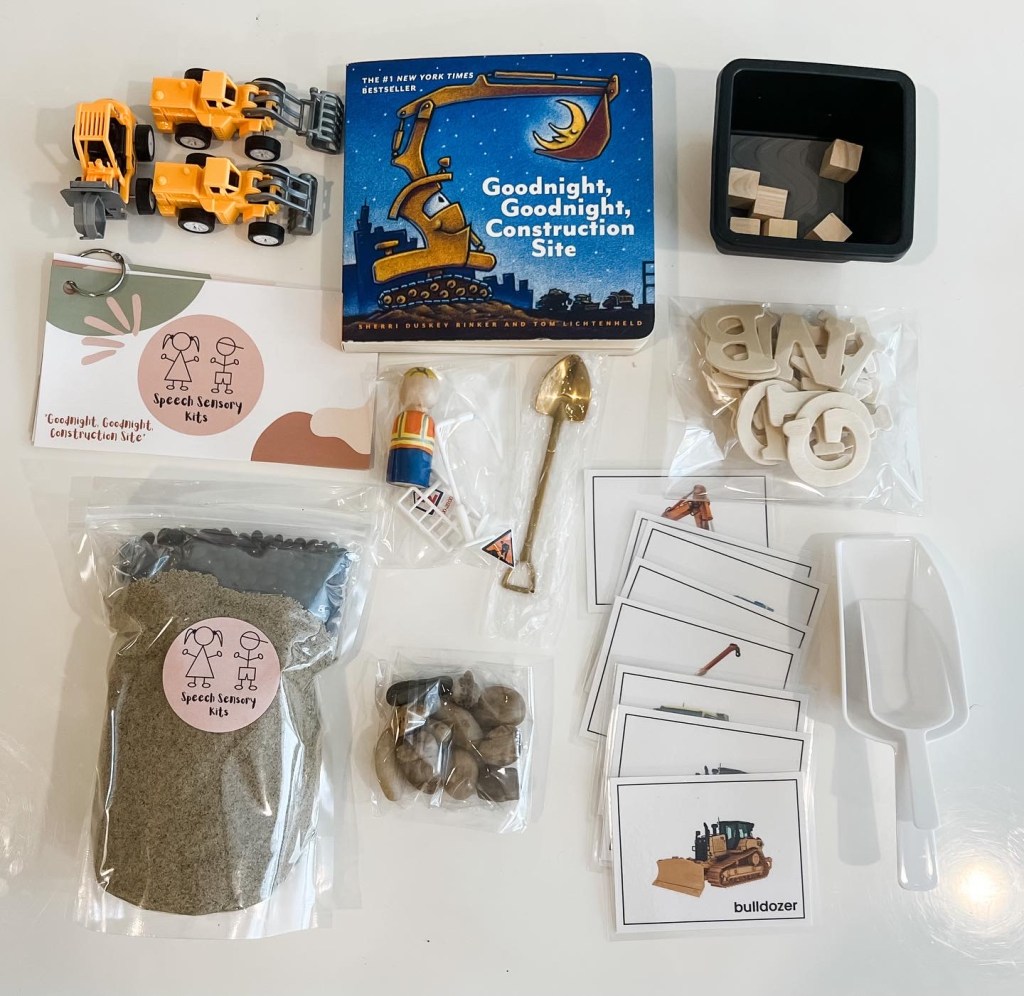 The “Goodnight, Goodnight, Construction Site” Speech Sensory Kit will help you build your speech and language skills. Work on letter sounds, answering question and prepositions as you learn about different construction vehicles. This kit includes the book.